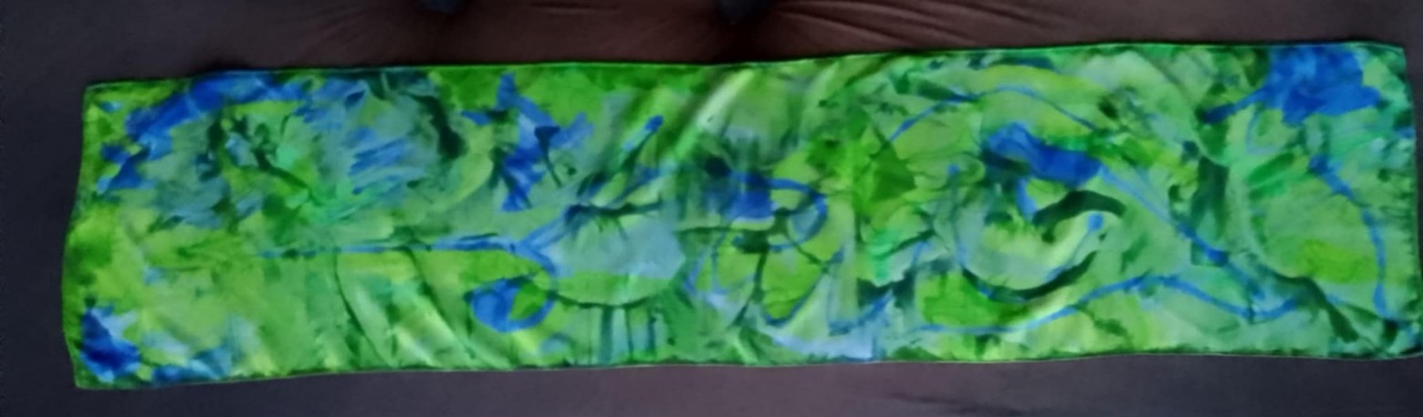 Jytte Harkjær der har HarKjærStrik, udstiller modeller af eget design, og sælger opskrifter samt færdigstrikkede modeller. Med sig på standen har Jytte, Lillieanes Farver, der udstiller og sælger håndmalede tørklæder + lidt håndfarvet garn.